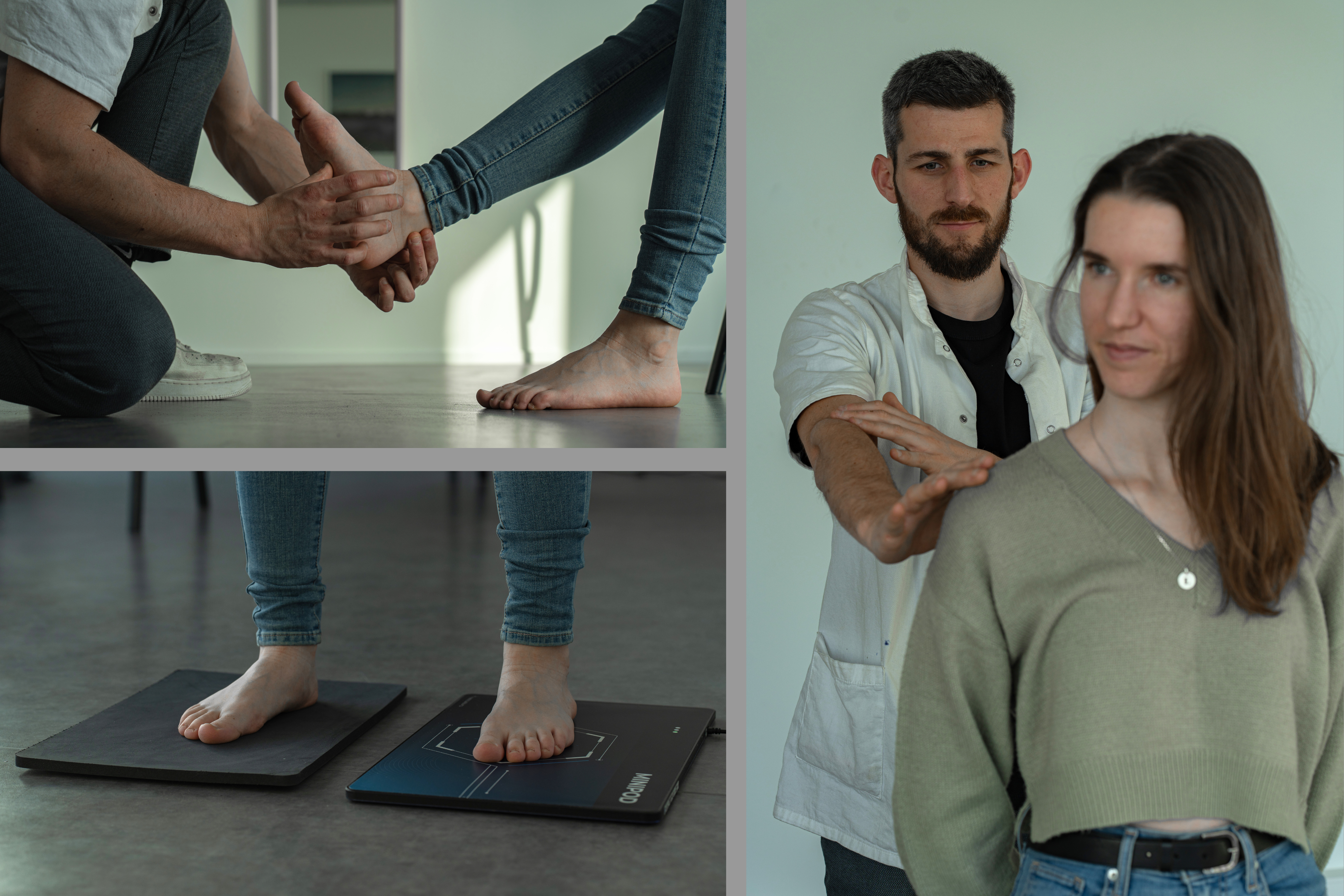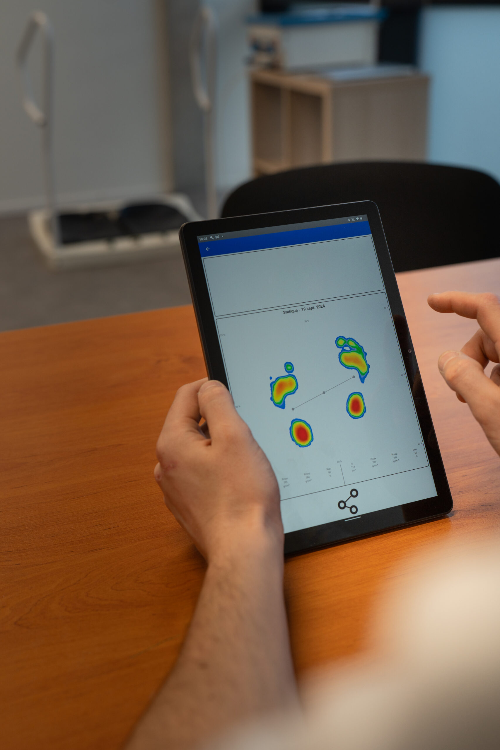 Par la suite, je réalise un examen musculaire et articulaire complet ainsi qu’une analyse en statique et en dynamique. Pour plus de précision, j’utilise une plateforme de podologie qui me permet d’étudier plus précisément les pressions plantaires statiques et dynamiques du patient.